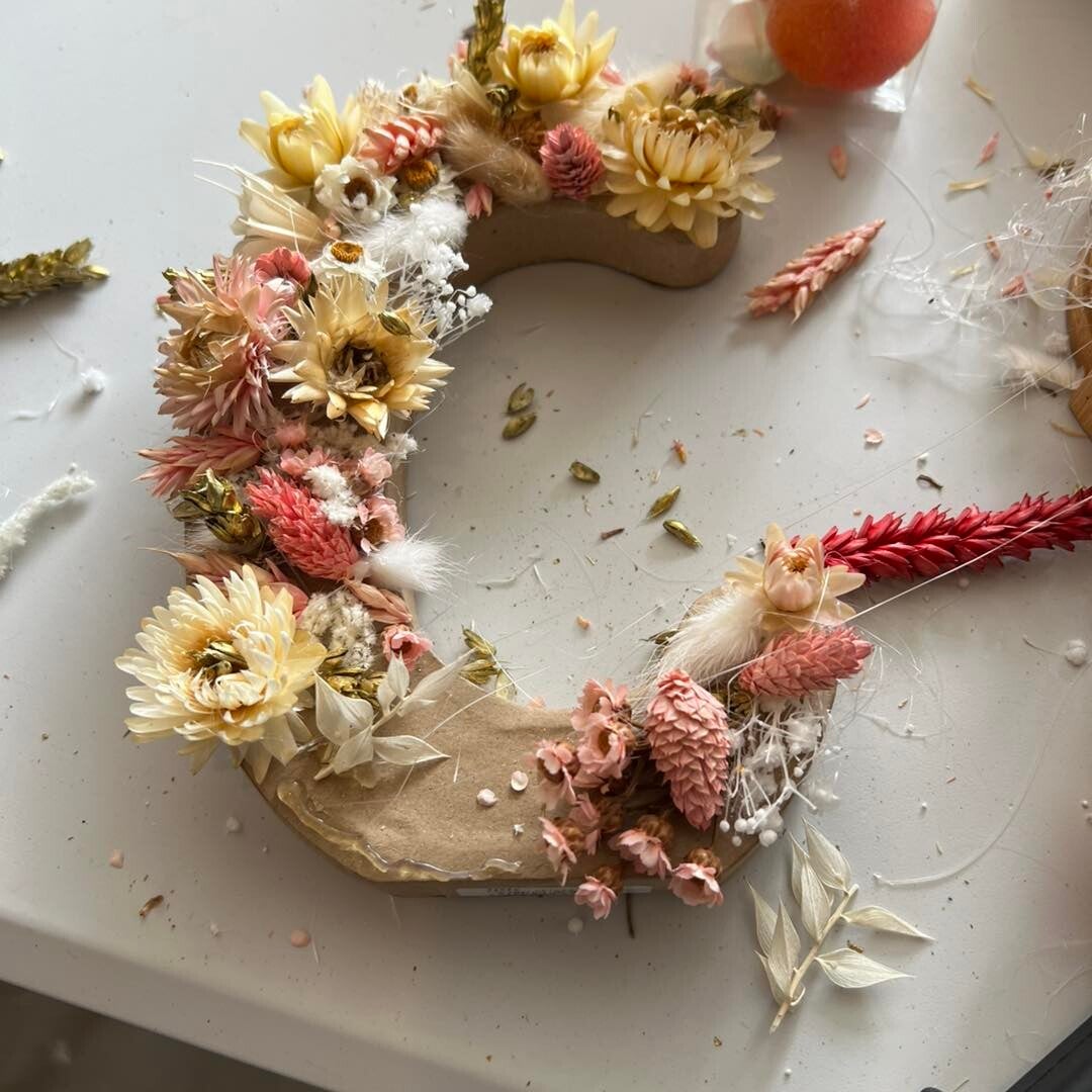 Je vous invite à un moment créatif et coloré pour réaliser une lettre décorée de fleurs séchées