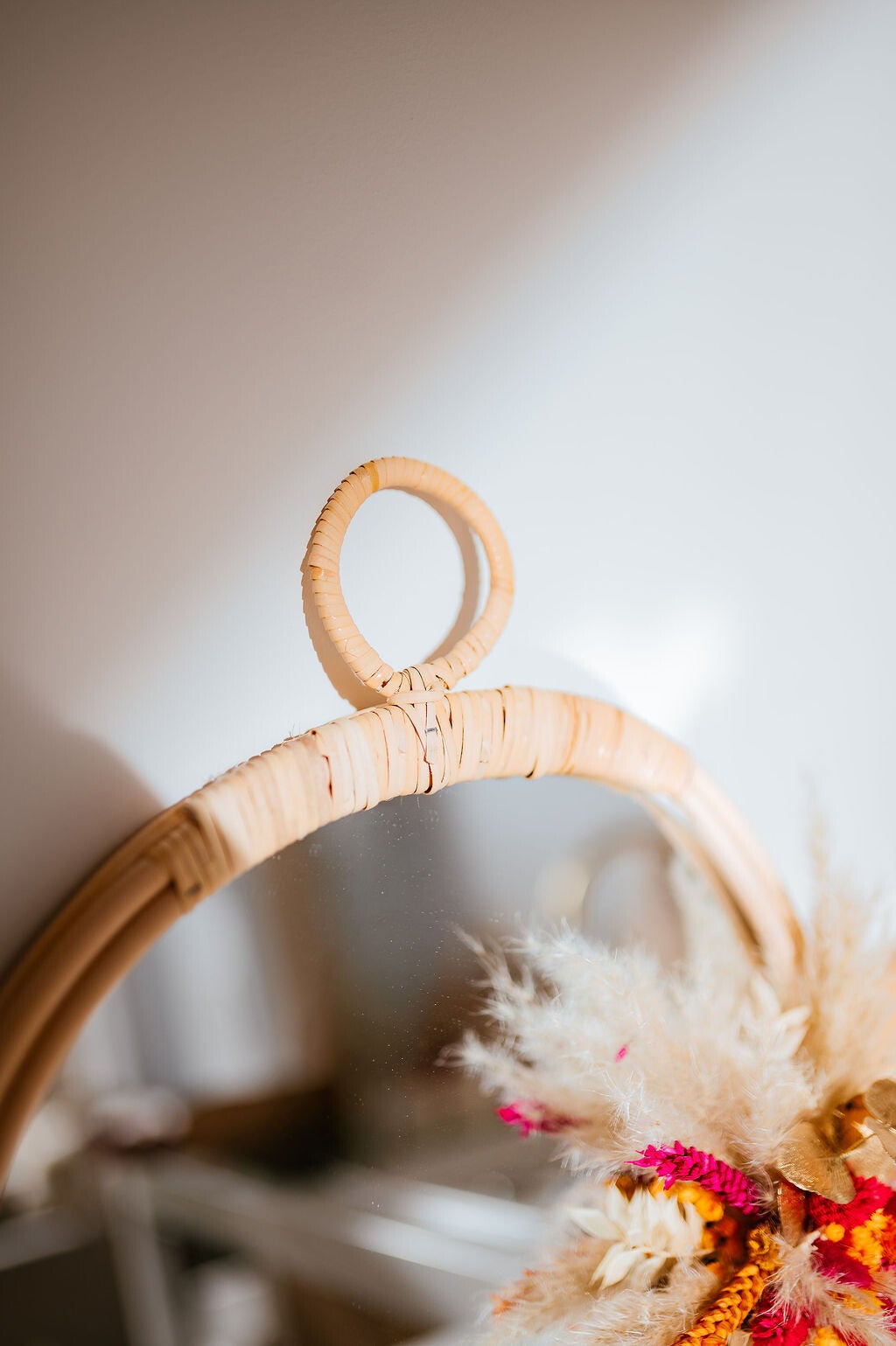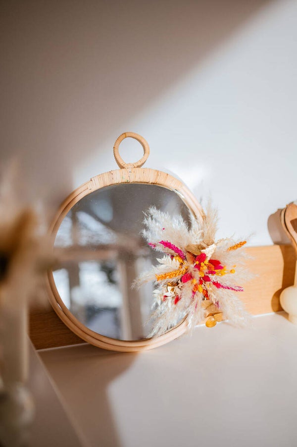 Miroir en rotin au style bohème, rehaussé de tons peps fuchsia et orangé pour une décoration audacieuse et joyeuse.