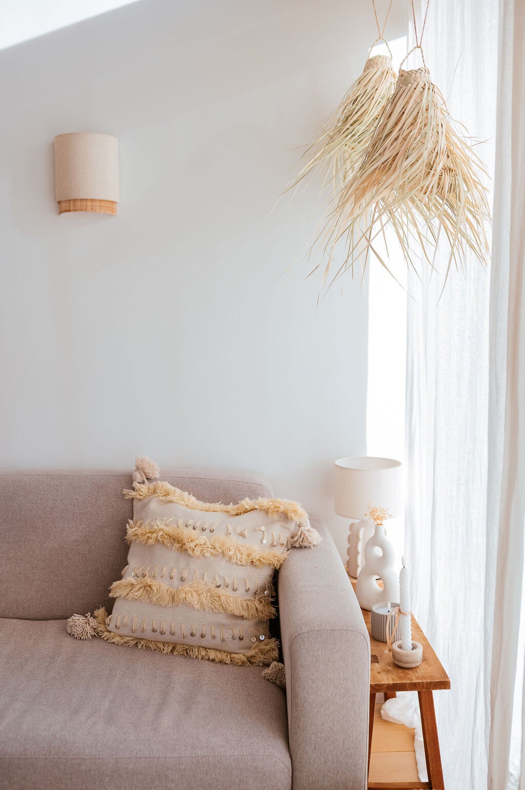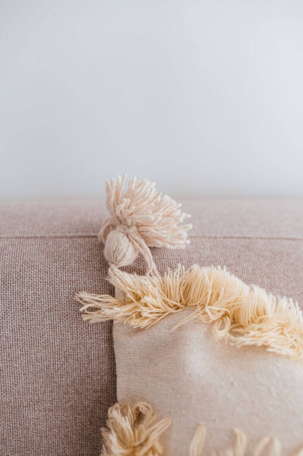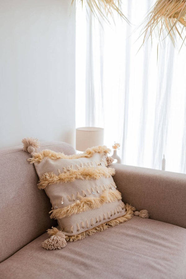 Superbe housse de coussin berbère beige, fabriqué à la main au Maroc selon un savoir-faire artisanal authentique. Orné de perles argentées, il apporte une touche élégante et chaleureuse à votre intérieur.Rembourrage non inclus.