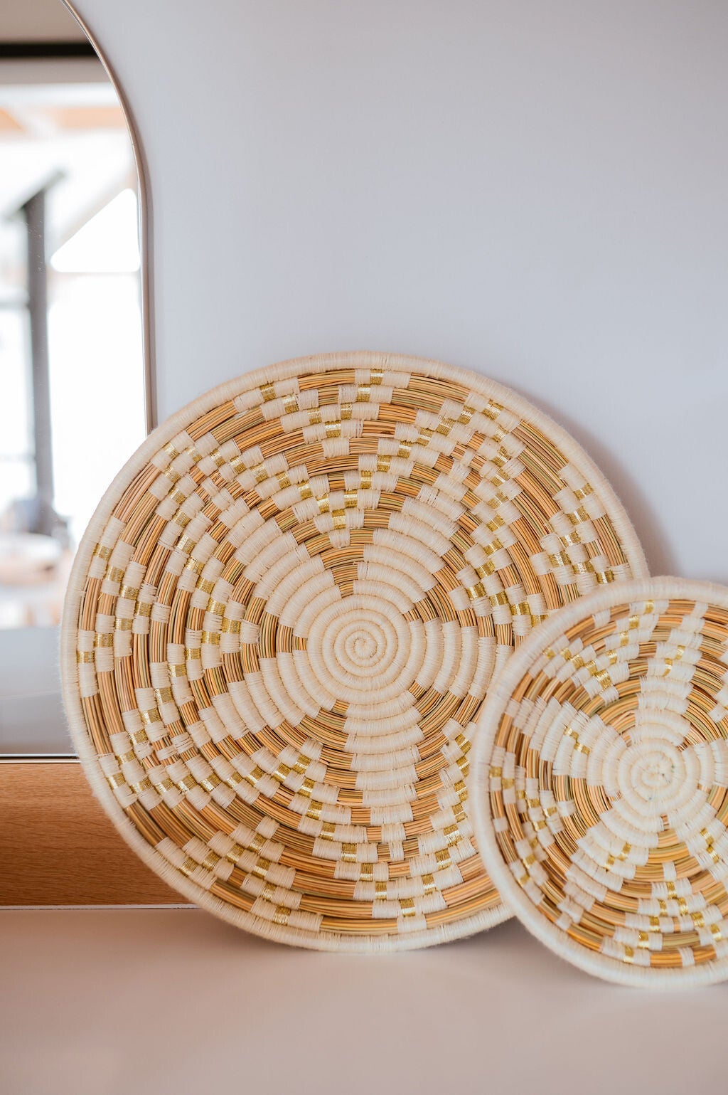 Décoration murale en fibres naturelles et coton, mêlant textures et matières avec élégance. À poser ou à accrocher selon votre envie, elle sublimera votre intérieur grâce à son style bohème et sa délicate touche dorée. Une pièce déco chaleureuse et unique qui attire le regard.