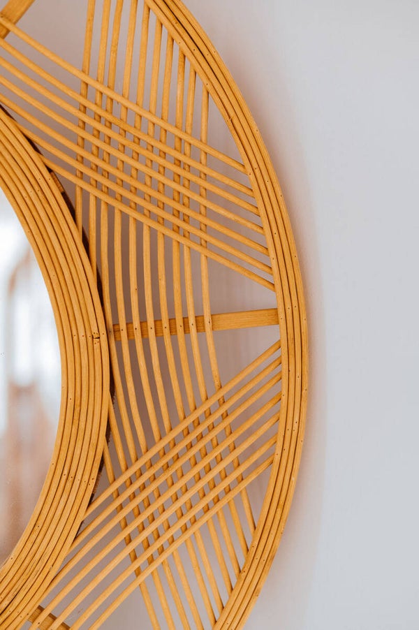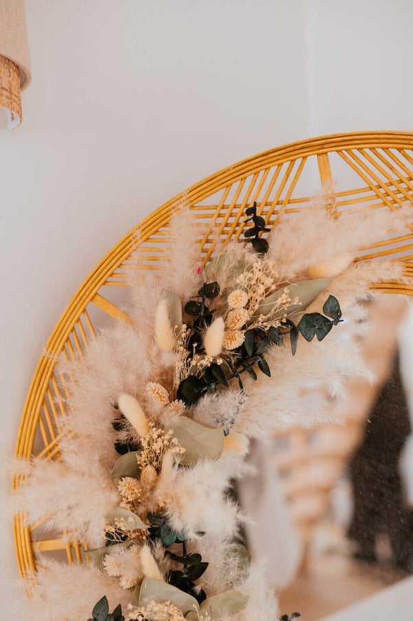 Miroir en bois artisanal, embelli de fleurs séchées aux couleurs harmonieuses de blanc, beige et eucalyptus. Chaque détail reflète un savoir-faire minutieux et un style naturel chic