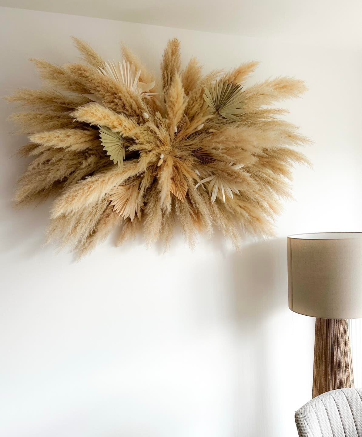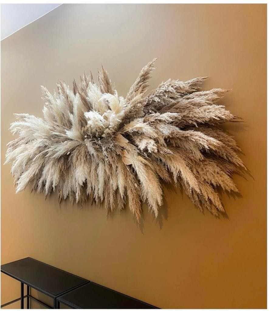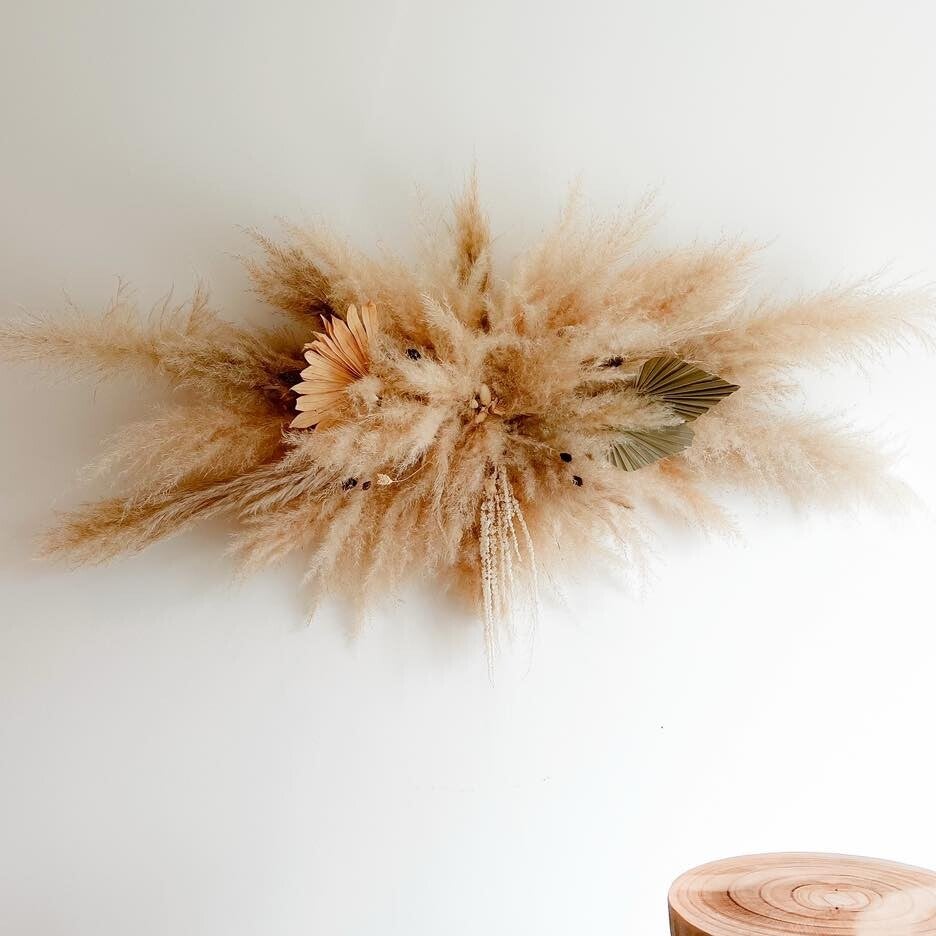 Montage mural de pampas et fleurs séchées, idéal pour habiller vos murs avec élégance. Plusieurs tailles sont disponibles, et vous pouvez également choisir les types de fleurs pour créer une composition unique et personnalisée